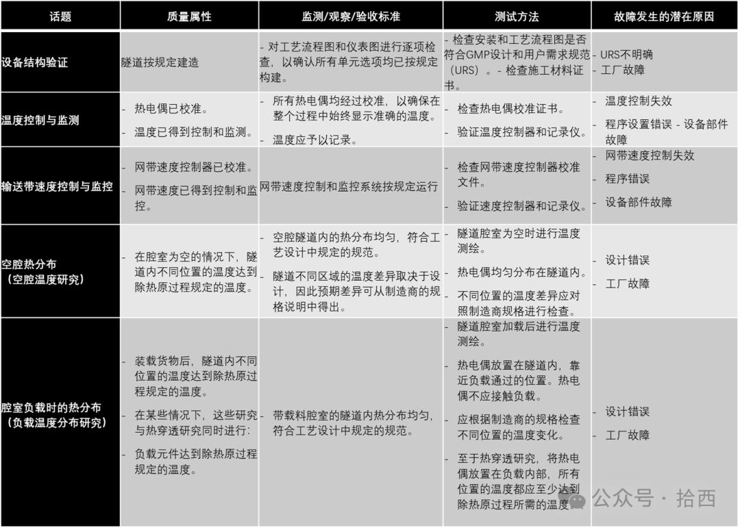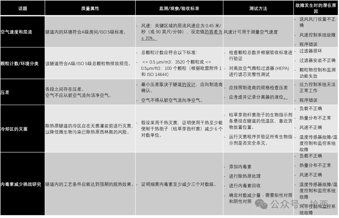 下表分别列举了,除热原工艺设计和验证过程中的主要要点以及发生故障时的潜在根本原因,以及除热原隧道资质评价的考虑因素,供参考。