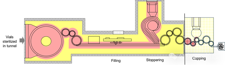 下图分别展示了西林瓶和RTU在隔离器内运行的灌装线示意图。红色区域代表受首过空气保护的CPA,黄色区域代表隔离器内部围绕CPA的PAA。此外,图中还显示了A级空气供应区域,用于保护已加塞的西林瓶直到压盖工序。